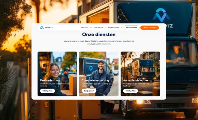 Wij vertaalden de identiteit van Moverz naar een moderne website met een duidelijke structuur en frisse uitstraling.